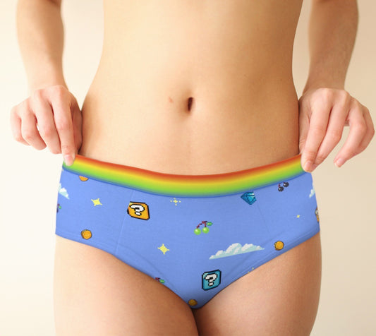 Gaymer Pride Women's Cheeky Briefs With Retro Video Game Pixel Art Pattern and Rainbow Elastic Waist Band