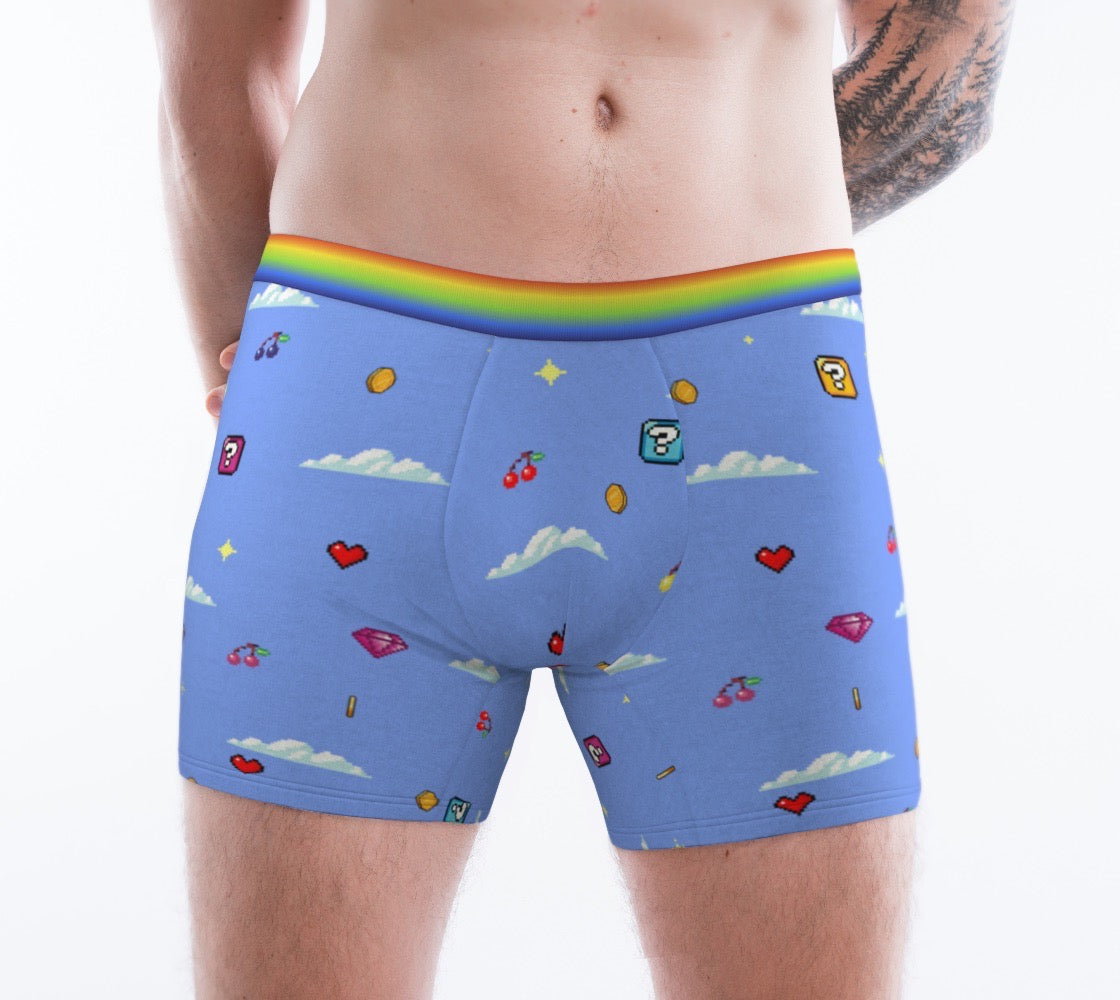 Gaymer Pride Men's Boxer Briefs With Retro Video Game Pixel Art Pattern and Rainbow Elastic Waist Band